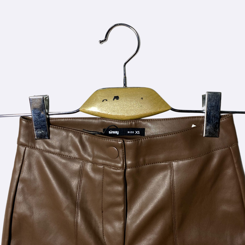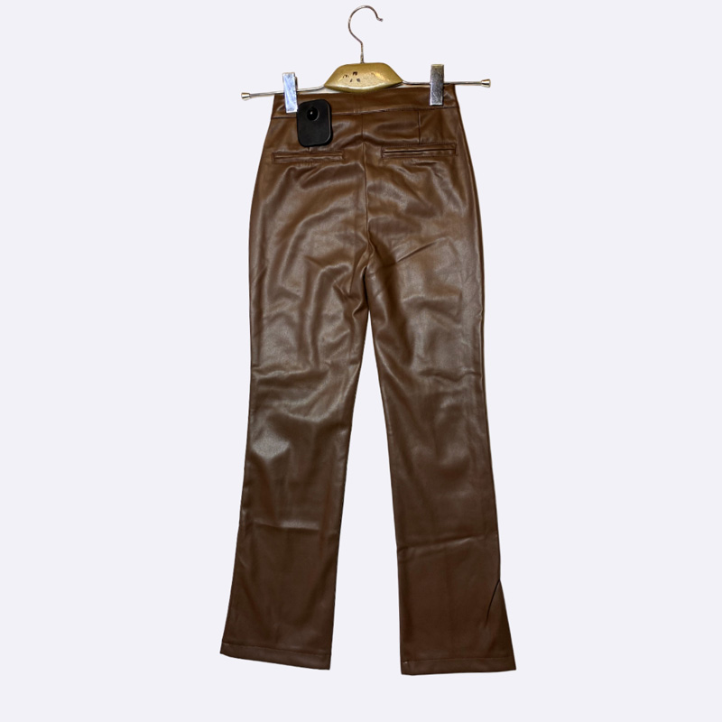 بنطلون أنيق من الجلد الصناعي، بخصر عالٍ ودرزات أمامية مميزة وقصة سفلية واسعة قليلاً
