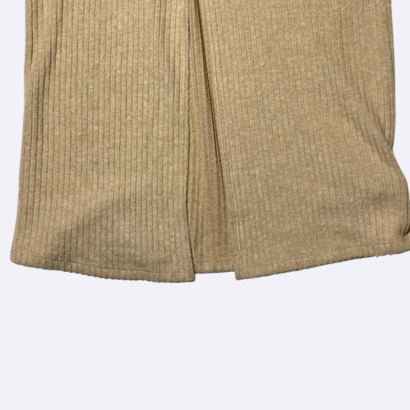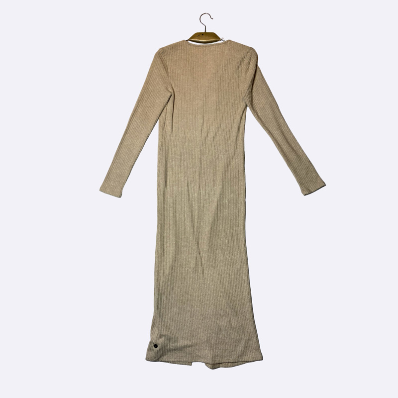 فستان ماكسي محبوك بقماش مضلع، يتميز بفتحة رقبة على شكل حرف V وفتحة سفلية أمامية.