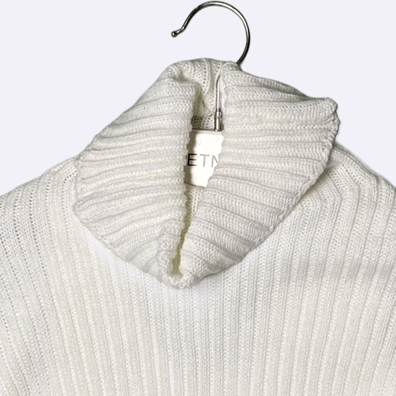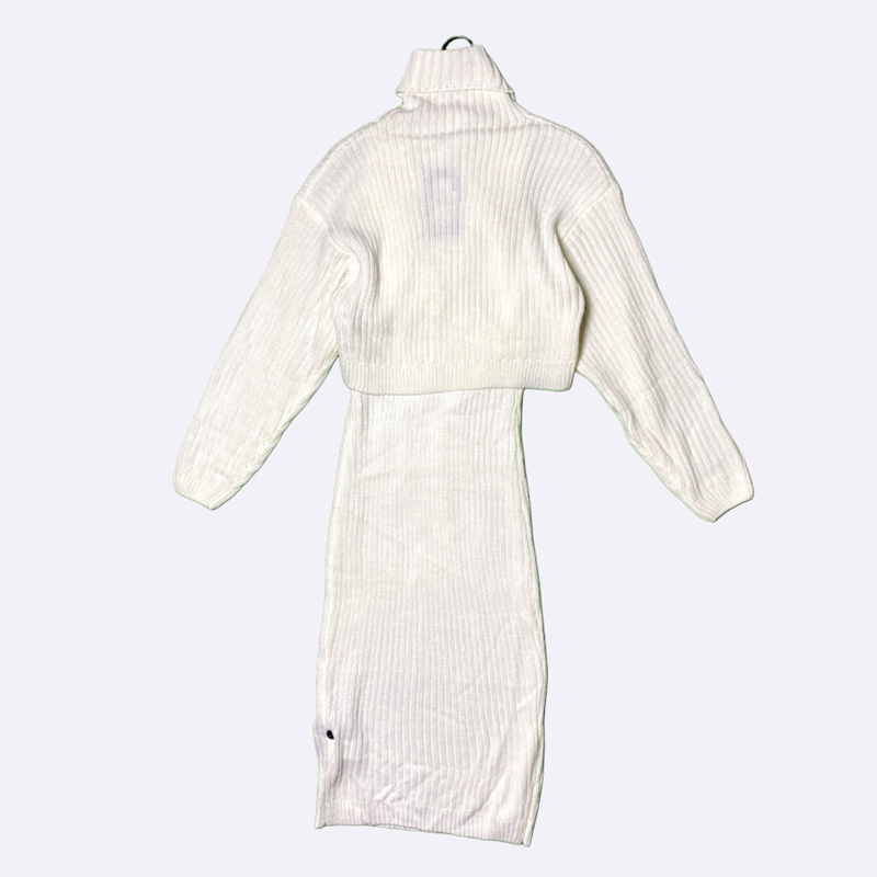طقم شتوي محبوك من قطعتين، يتكون من فستان ميدي (طويل) وكنزة قصيرة فضفاضة بياقة عالية.