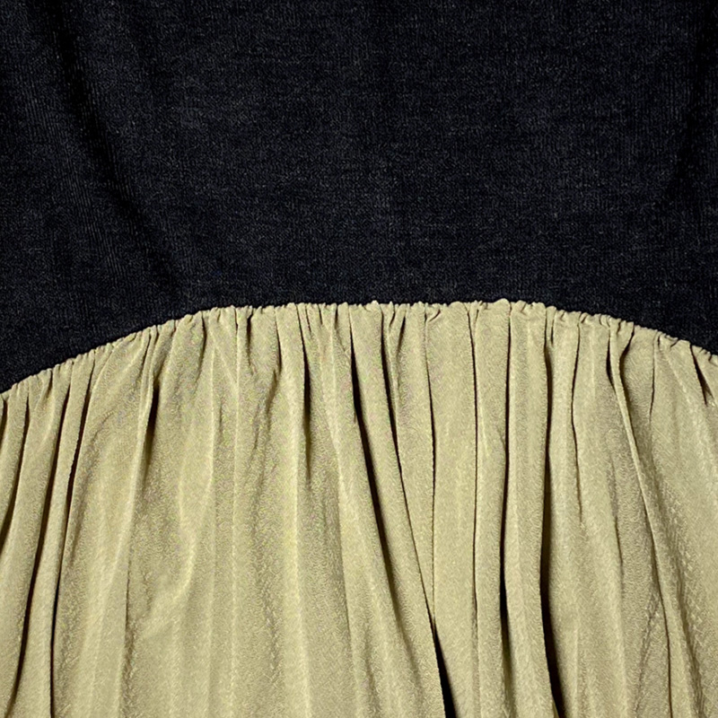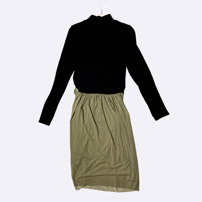 فستان ميدي يجمع بين جزء علوي محبوك بياقة عالية وأكمام طويلة، وجزء سفلي واسع ومنسدل ومكشكش.