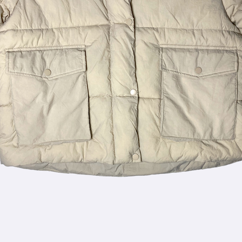 جاكيت منفوخ (بافر) نسائي قصير ودافئ، يتميز بياقة عالية وأزرار أمامية وجيوب كبيرة بغطاء
