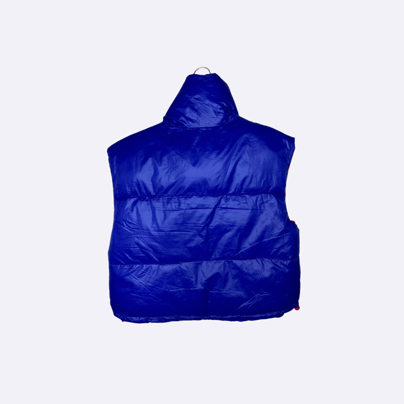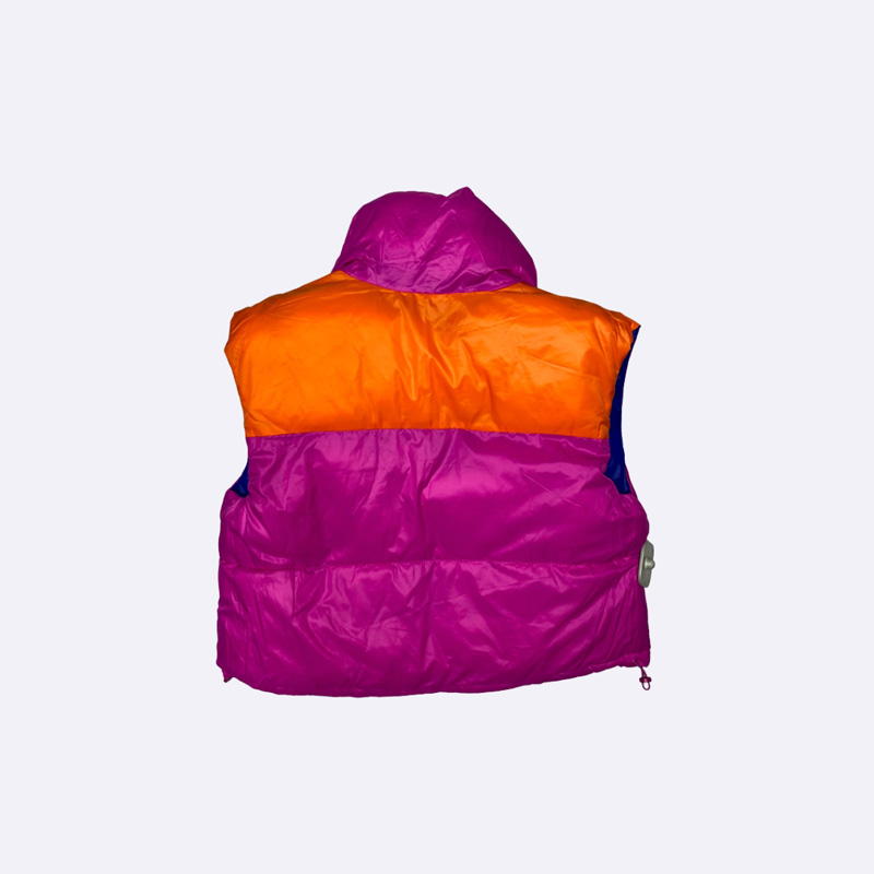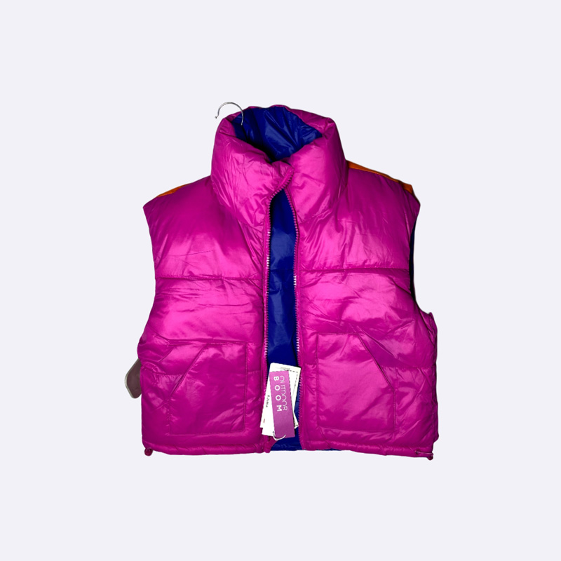 سترة (فيست) قصيرة ومنفوخة (بافر)، تتميز بياقة عالية وسحاب أمامي كامل وجيوب جانبية.