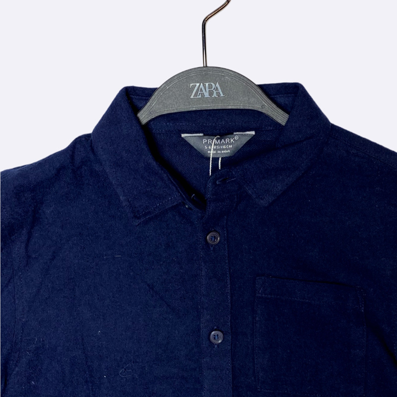 قميص أطفال أنيق بلون كحلي داكن من Primark، مصنوع من قماش خفيف ومريح يناسب اللبس اليومي والمناسبات. يأتي بتصميم كلاسيكي مع أزرار أمامية وجيب صغير، مناسب لفصل الخريف والشتاء.