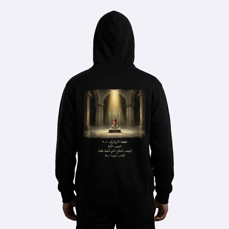 هودي بتصميم فني معبّر يجسد شعلة الثورة داخل قاعة تاريخية، كرمز لصمود الشعب السوري وإرادته التي لا تنطفئ. خامة مريحة وطبعة عالية الجودة، مناسب للارتداء اليومي وللمهتمين بالقطع ذات الرسالة الإنسانية والوطنية.