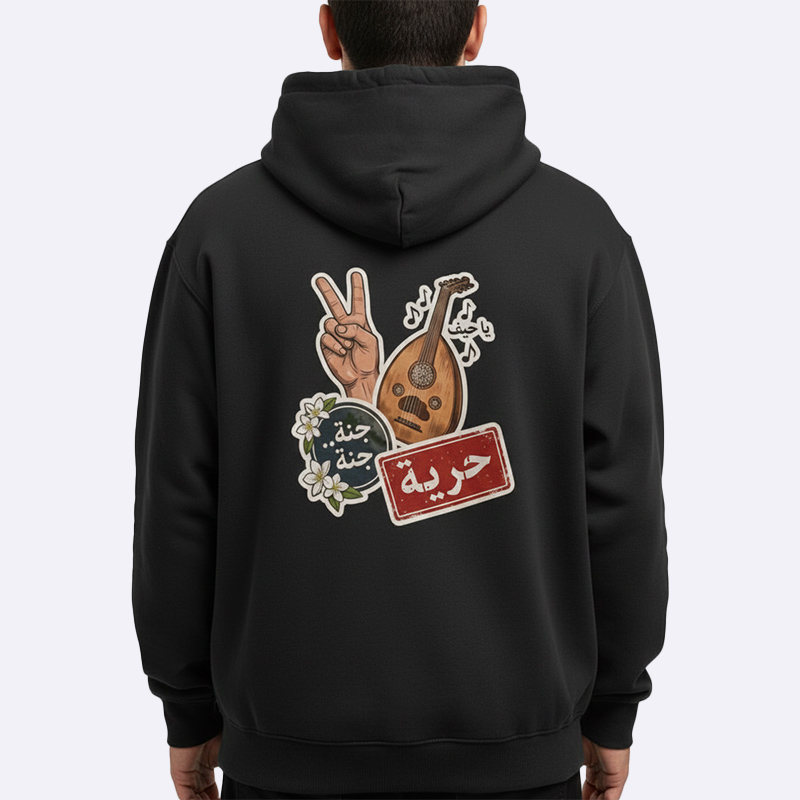 هودي بتصميم شبابي مستوحى من رموز الثورة: علامة النصر، العود، الياسمين، وكلمة حرية. طابع مرح وإيجابي يعبر عن روح السوريين.