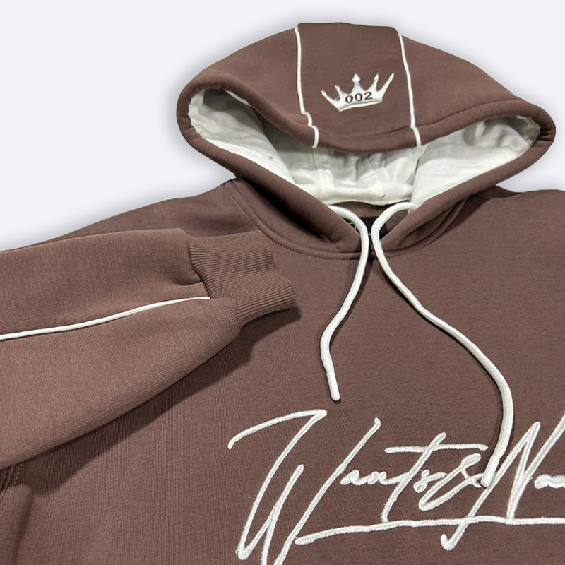 طقم مريح يتكون من هودي بقلنسوة وبنطال بجيوب جانبية، مزين بتفاصيل خطوط وتطريز أنيق.