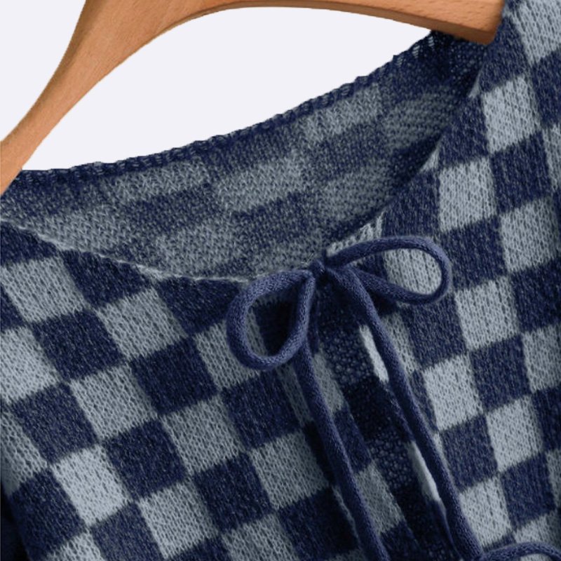 تألقي بإطلالة عصرية مع هذا التوب المحبوك بتصميم مربعات أنيق. يتميز برباط أمامي وأكمام بالون لإطلالة مريحة وعصرية.