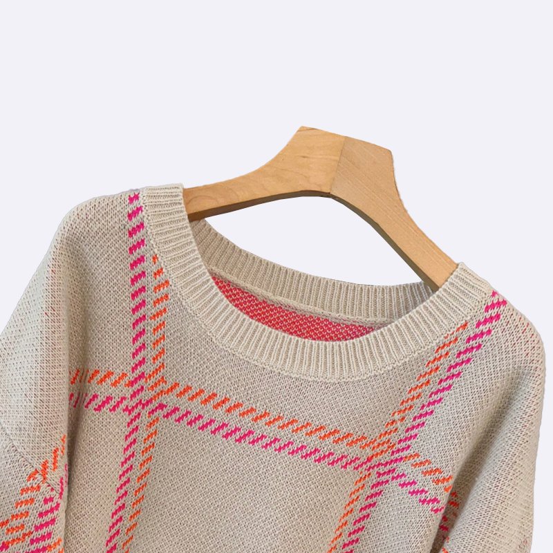 أضيفي لمسة من الأناقة إلى خزانة ملابسك مع هذه الكنزة المحبوكة بنقشة مربعات. تصميم عصري ومريح يجعله الخيار الأمثل لإطلالة يومية أنيقة.