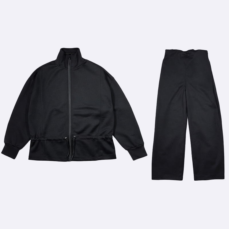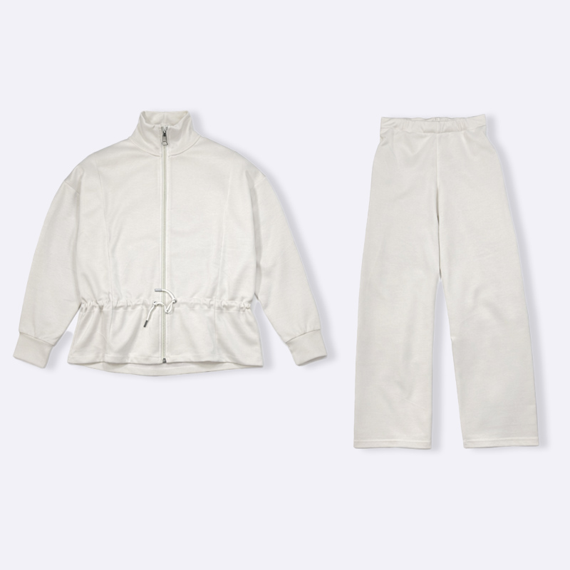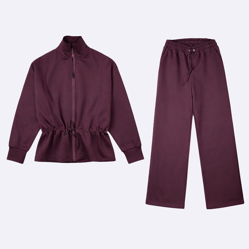استمتعي بإطلالة عصرية ومريحة مع هذا الطقم الرياضي النسائي الأنيق. يتميز بجاكيت بسحاب وبنطلون واسع الأرجل، مما يجعله مثالياً للاسترخاء أو الخروج في نزهة.