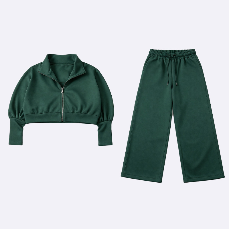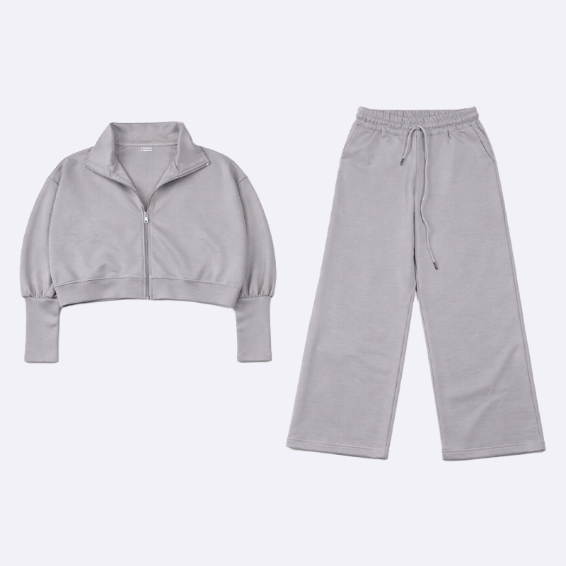 استعدي للتمرين بأناقة مع هذا الطقم الرياضي النسائي المريح والأنيق. يتضمن الطقم سترة بسحاب وبنطلون واسع وحمالة صدر رياضية مريحة، مثالي لليوجا أو الاسترخاء في المنزل.